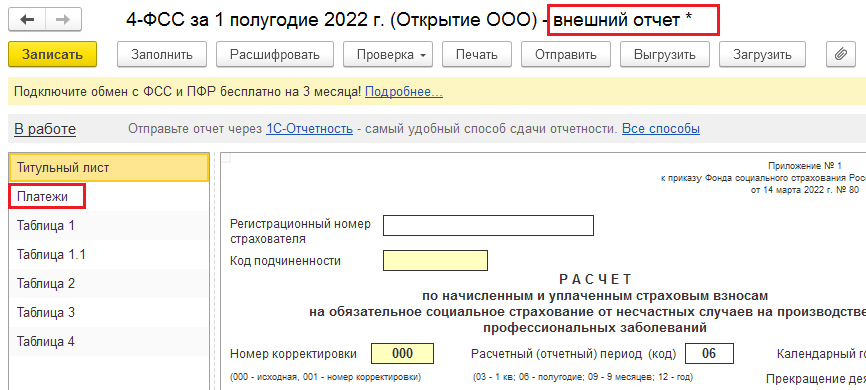 После перезагрузки зайдите в справочник регламентированных отчетов и создайте новый отчет 4-ФСС. Если закладка "Платежи" появилась, значит вы все сделали верно. Отчет поддерживает автоматическое заполнение данными по кнопке "Заполнить".