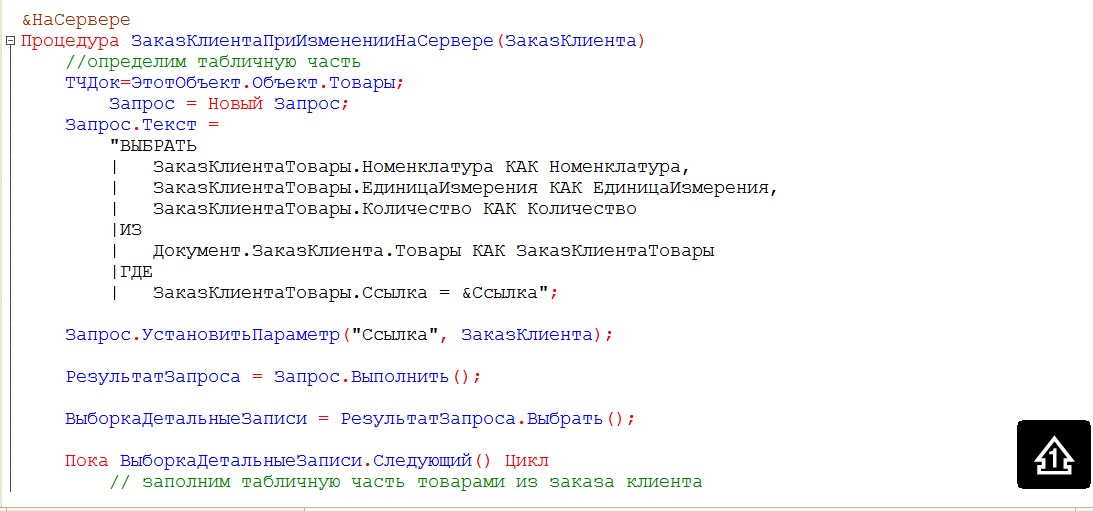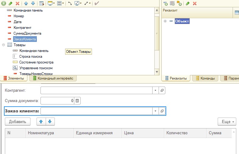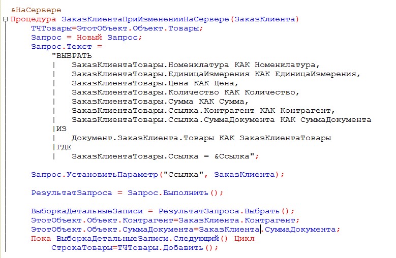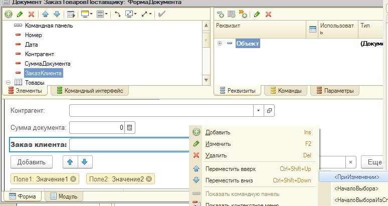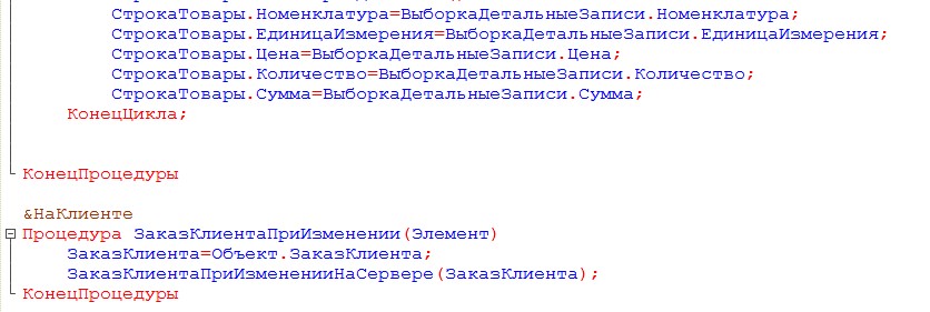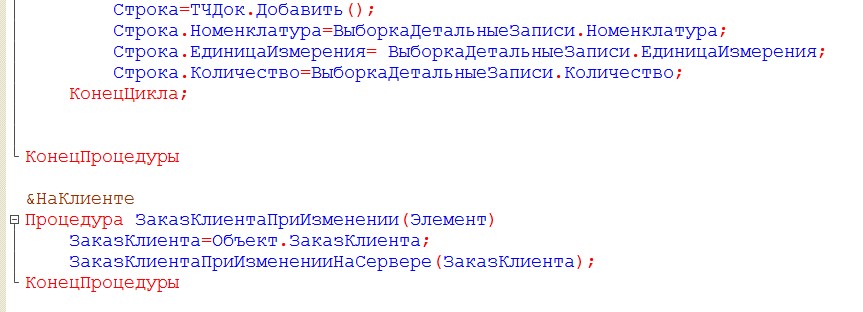 Напишем обработчик события при изменении реквизита Заказ клиента.