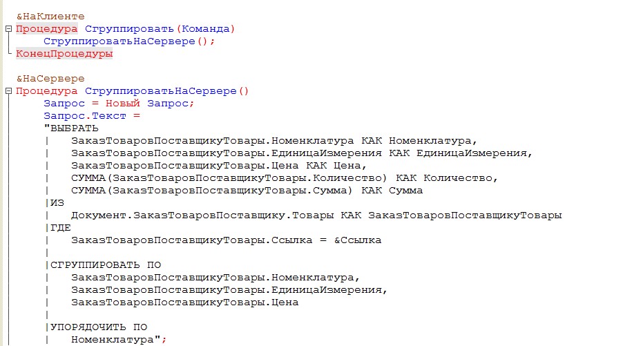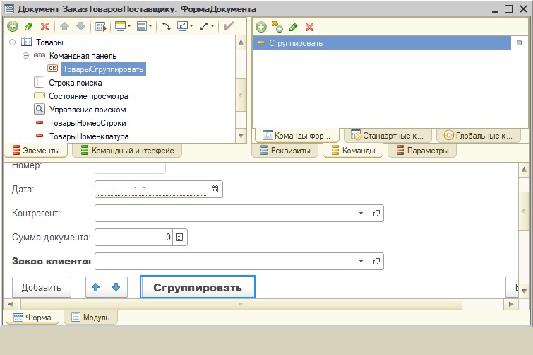 Напишем процедуру обработчик команды Сгруппировать. Сгруппированный список товаров определяет сводный заказ товаров у поставщика.Для отражения факта поступления товаров от поставщика создадим документ.