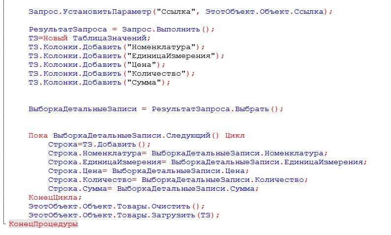 Эта процедура заполняет табличную часть документа заказ поставщику.