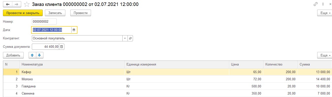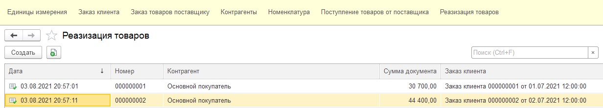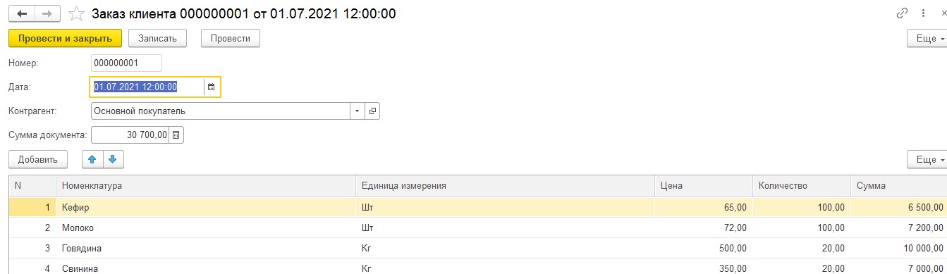 Создадим документ Заказ клиента.