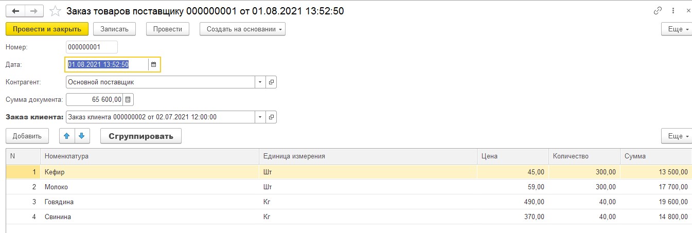 - Создадим документ Заказ товаров поставщику, заполним его, выбрав Заказы клиентов и сгруппируем заказанные товары.