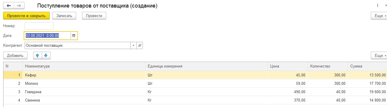 - Получим товары от поставщика, оформив документ Поступление товаров.