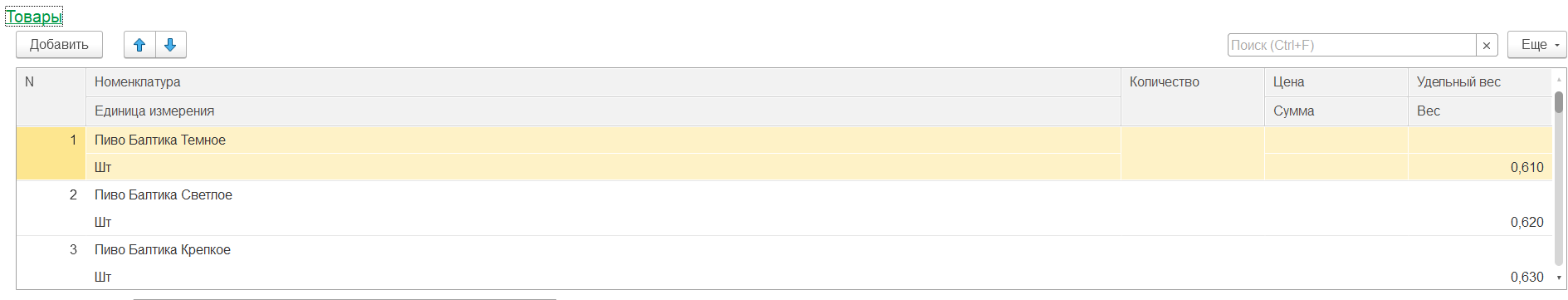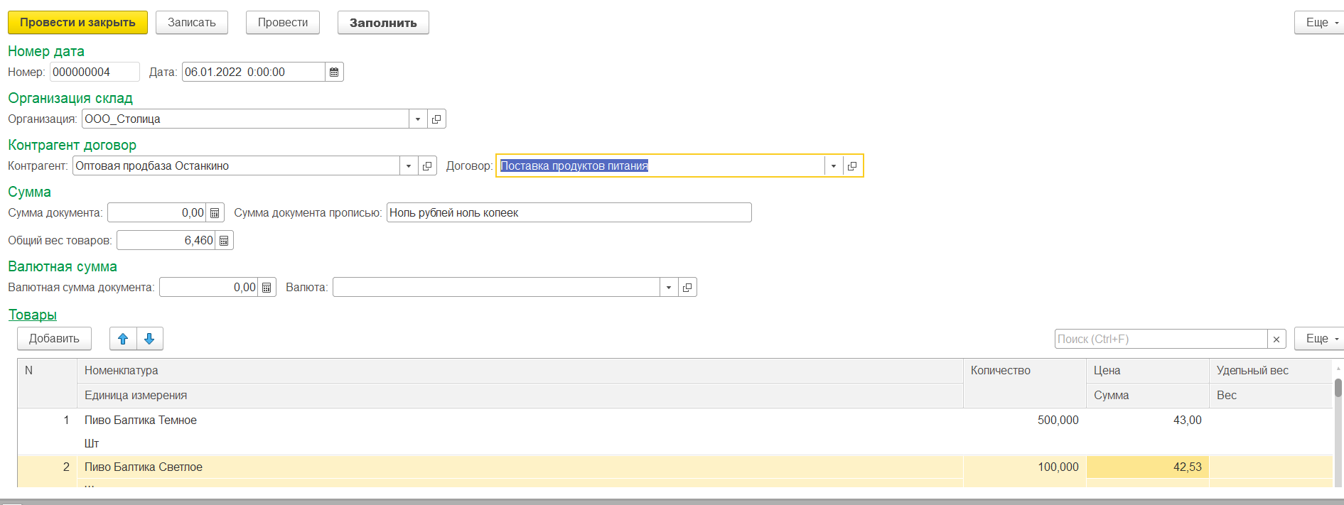Осталось теперь при записи документа заполнить реквизиты строк табличной части, в которых отражены поступившие товары, удалить строки с номенклатурой, которая не поступила и заполнить реквизиты шапки документа.