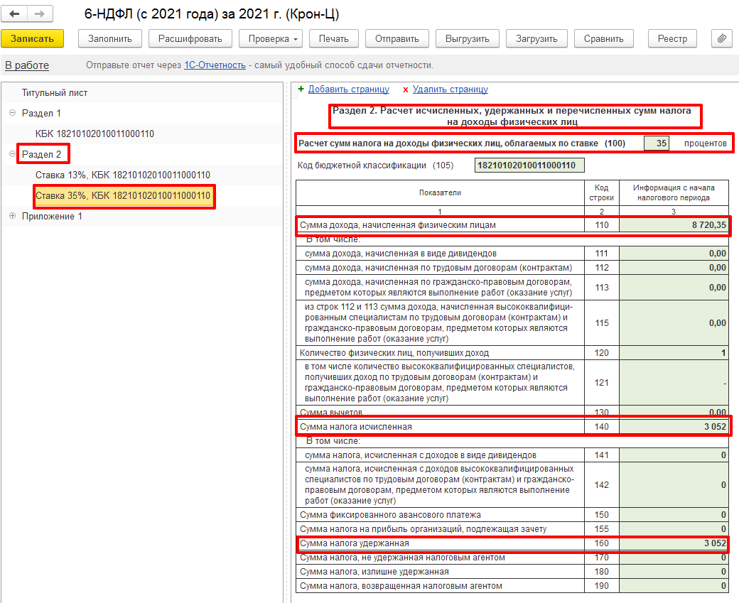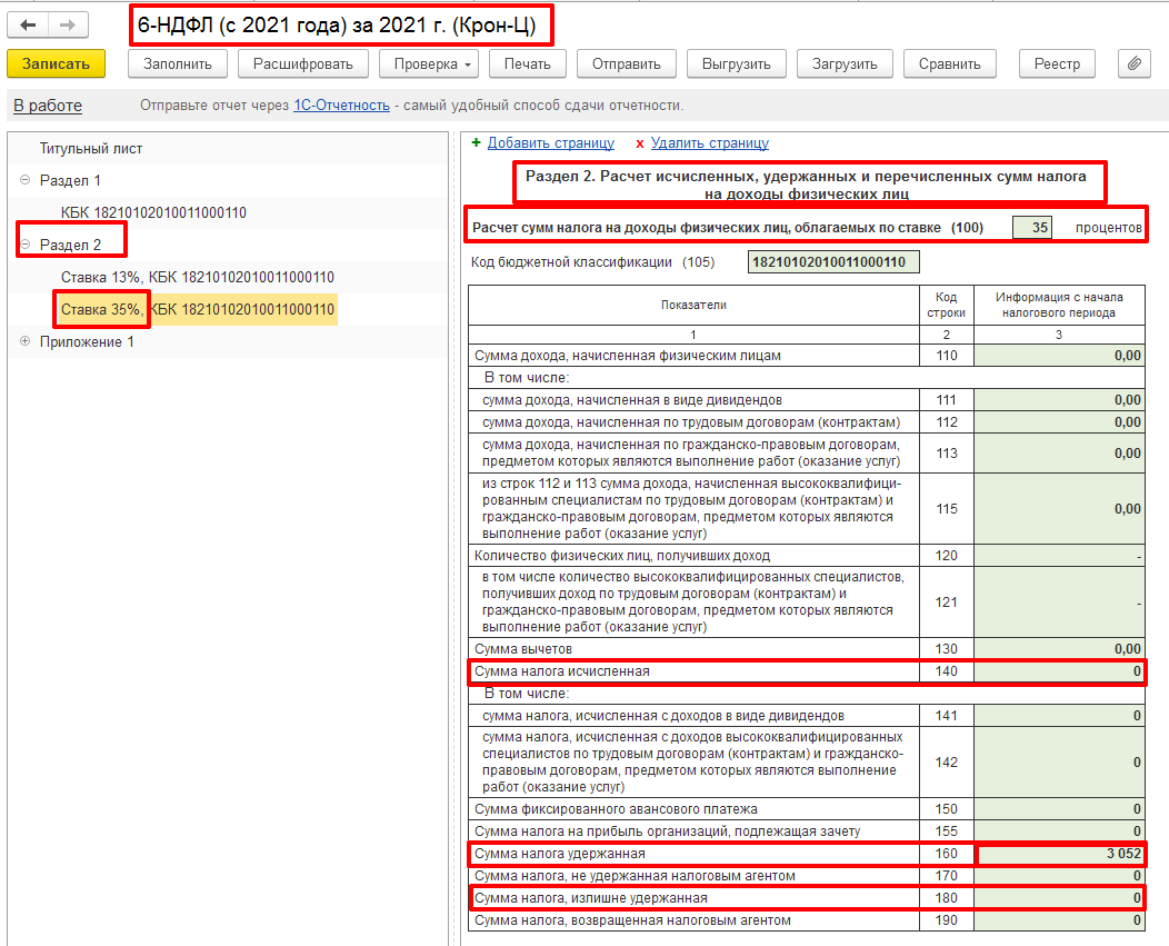 - Заполнен Раздел 2 по Ставке 35 %