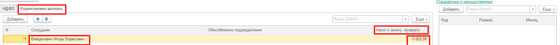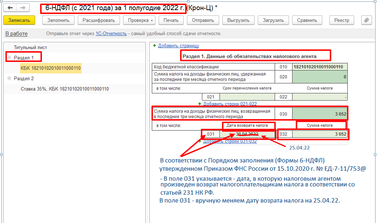 Возврат излишне удержанного НДФЛ будет отражен в Отчетности за тот период, когда его вернули сотруднику. В нашем примере НДФЛ вернули в Апреле 2022 года (в поле Месяц Документа «Возврат налога» указан месяц Апрель). Поэтому, он будет отражен в Разделах 1 и 2 Расчета 6-НДФЛ за полугодие 2022 года – в строке 190 Раздела 2 и в блоке строк 030 - 032 Раздела 1.
