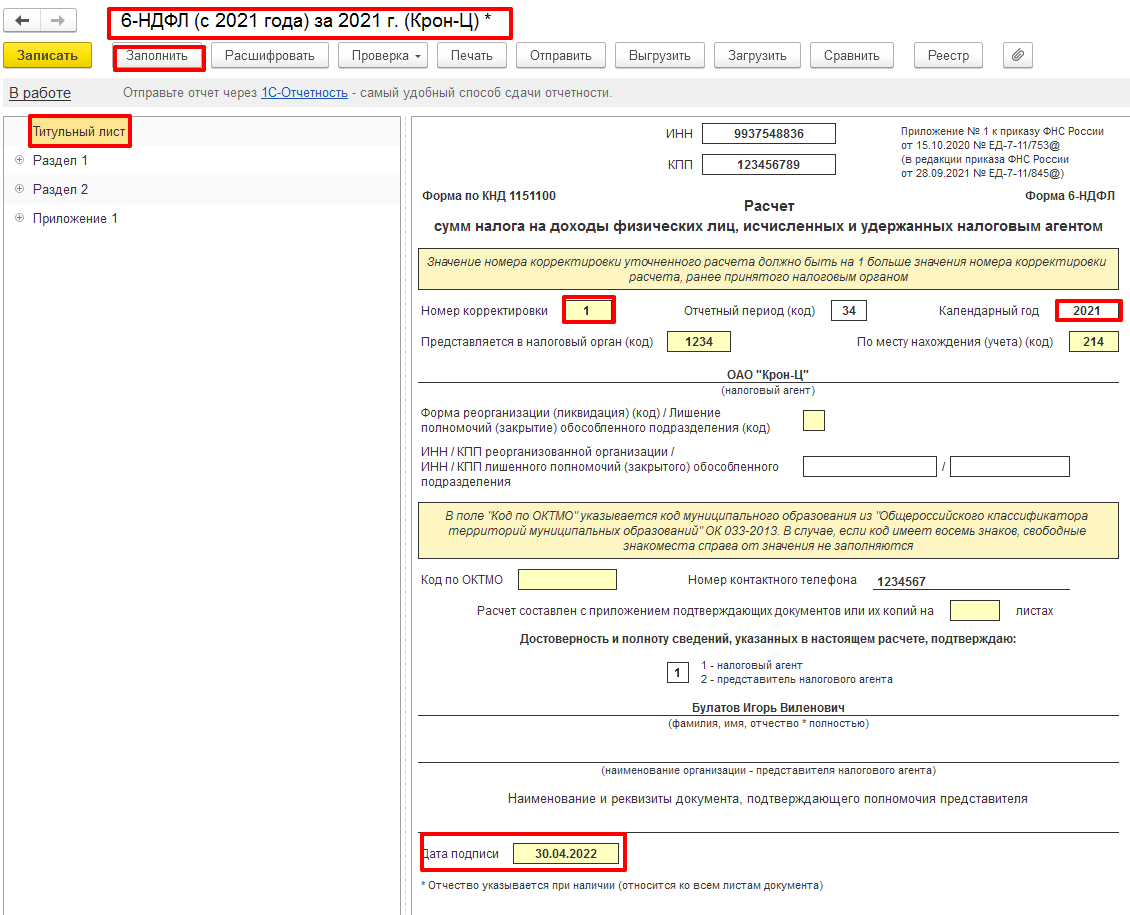 В программе, Движения документа «Перерасчет НДФЛ» учитываются на последний день месяца, в котором произведен Перерасчет налога (поле «Месяц перерасчета»). В нашем примере Перерасчет сделан в Апреле месяце 2022 г., поэтому Дату подписи Расчета на Титульном листе меняем вручную на 30.04.2022 г. Кнопка «Заполнить». Перед отправкой Расчета в ИФНС, в поле Дата подписи укажите необходимую Вам дату и отчет не перезаполняйте.