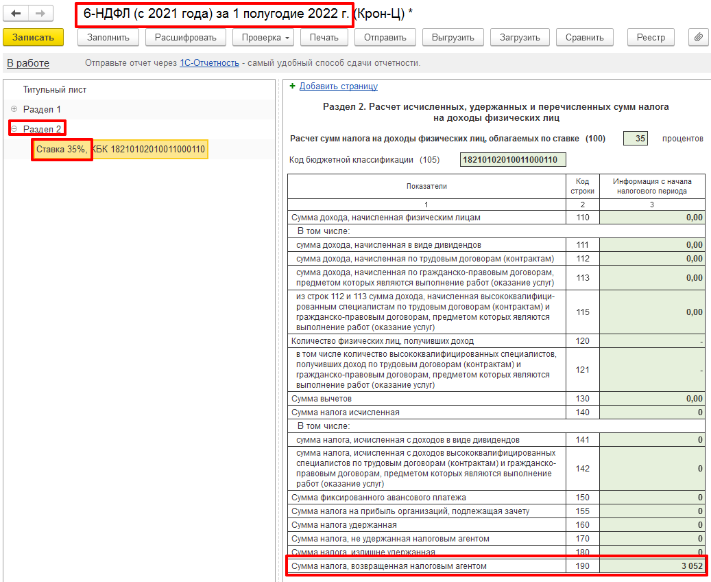 В Разделе 2 по Ставке 35 % будет заполнена только строка 160 «Сумма налога удержанная» (так как налог действительно был удержан в этом отчетном периоде). Строка 180 «Сумма налога, излишне удержанная» заполнена не будет, потому что мы вернули излишне удержанный НДФЛ сотруднику (документ «Возврат НДФЛ»). В программе излишне удержанный налог, который отражается в строке 180, определяется на дату подписи отчета (Титульный лист).