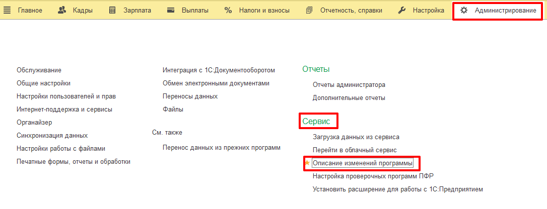Раздел – Администрирование – Сервис – Описание изменений программы.