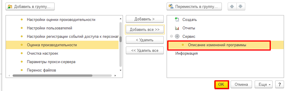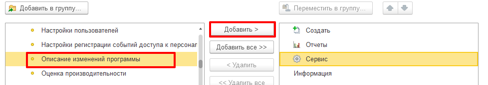 Раздел – Администрирование – кнопка «Настройки» – Настройка действий – Сервис – Описание изменений программы – Добавить – Ок.