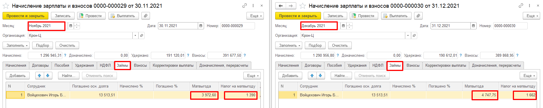 Сотруднику Войцехович И.Б. 01.11.21 г. выдан заём. За период с 01.11.21г. по 31.12.21г. сотруднику начислен доход в виде материальной выгоды в сумме – 8720 руб. 35 коп., и исчислен налог НДФЛ на материальную выгоду в сумме – 3052 руб. 00 коп.