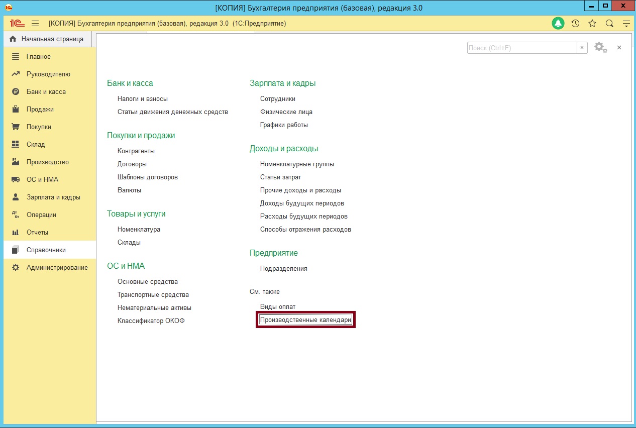 Откройте раздел Справочники в меню разделов. В подразделе См. также найдите пункт Производственные календари.