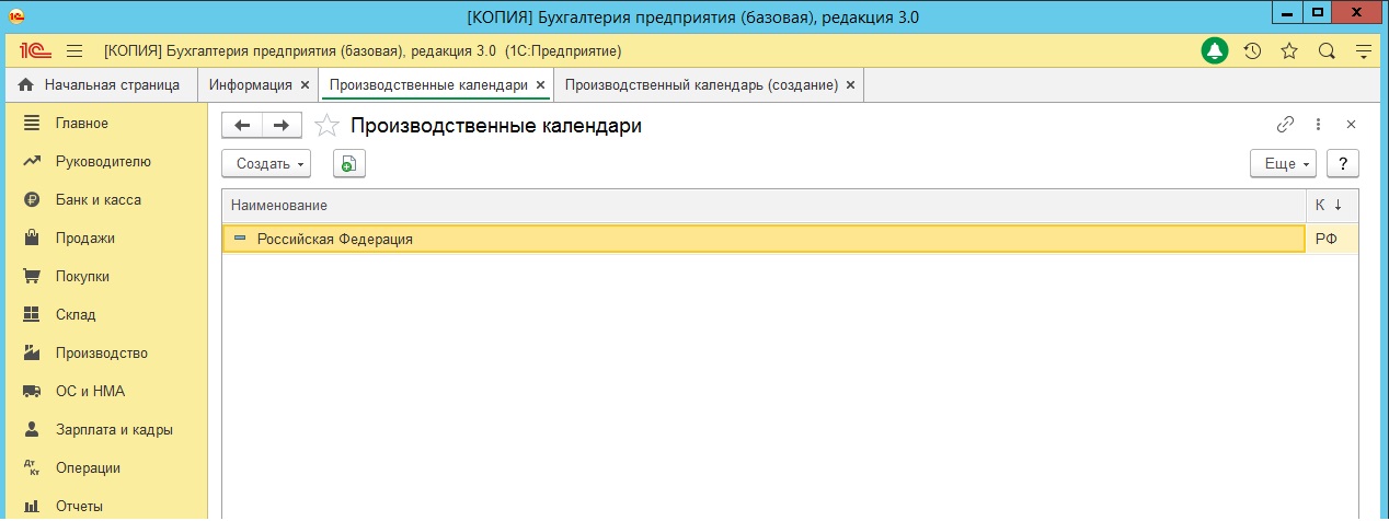 Справочник Производственные календари содержит все созданные в базе календари.
