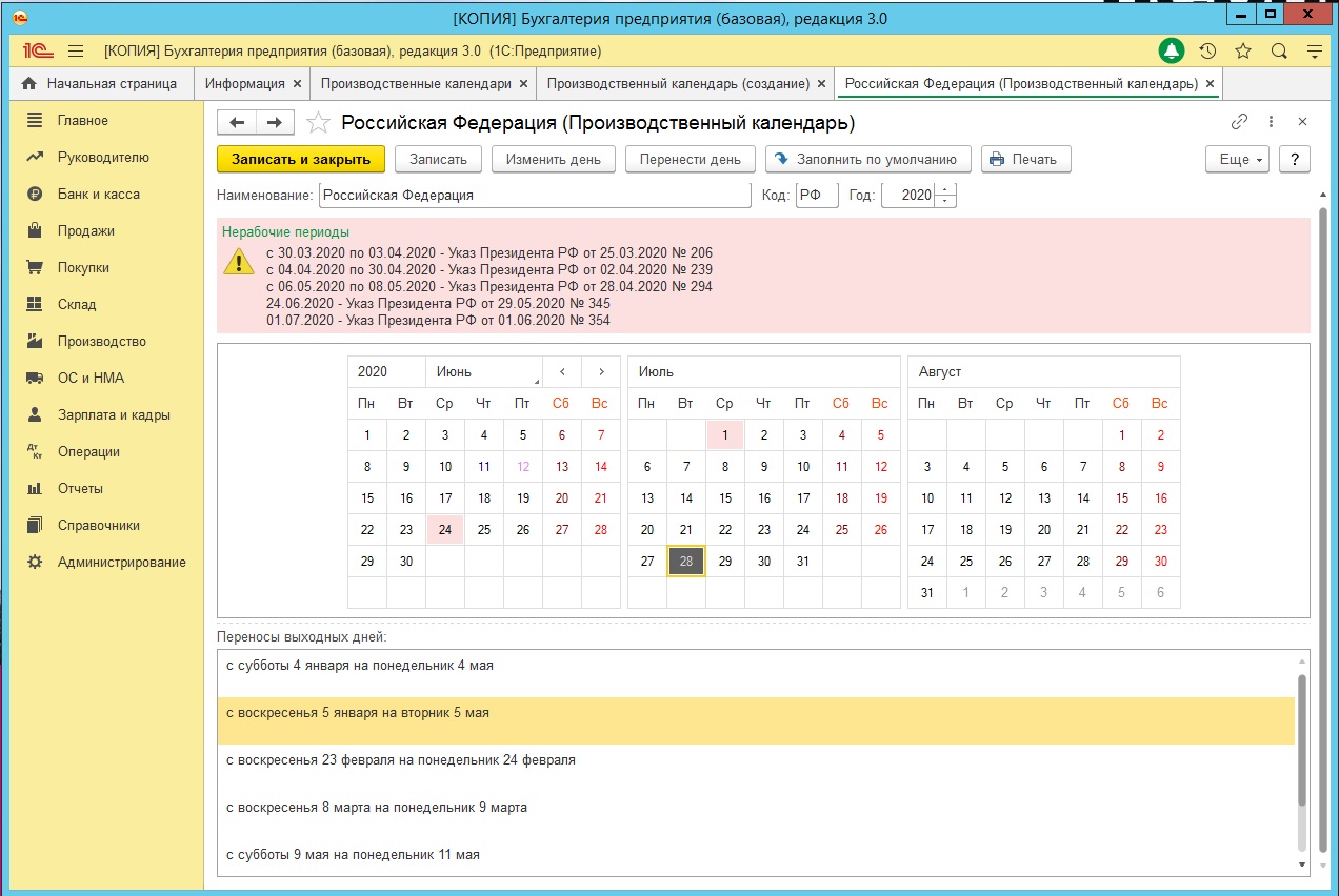По умолчанию используется производственный календарь «Российская Федерация», который заполняется автоматически в соответствии с федеральными законами и постановлениями. Вот так выглядит производственный календарь в программе 1С.