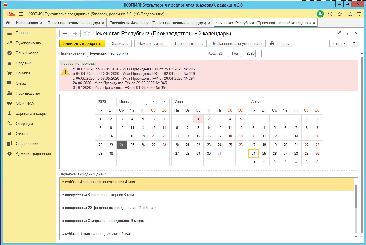 Стандартные функции для редактирования производственного календаря в 1С: