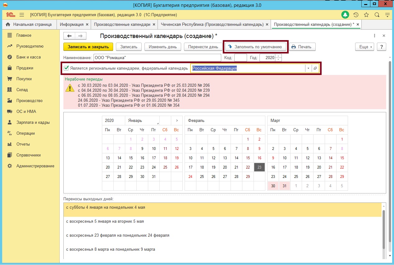 Если вы нажмете кнопку Заполнить по умолчанию, то календарь заполнится в соответствии со стандартной пятидневной рабочей неделей, без учета официальных праздников и переносов. Если в качестве шаблона вы хотите использовать официальный производственный календарь РФ со всеми праздниками, поставьте флаг Является региональным календарем... и укажите федеральный календарь Российская Федерация. Теперь нажмите на кнопку Заполнить по умолчанию.