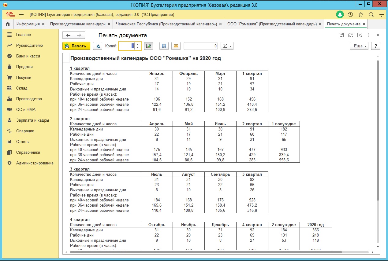 Как распечатать производственный календарь в программе 1С:Бухгалтерия 8?